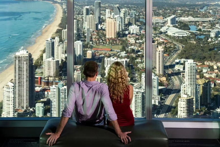 SkyPoint Observation Deck ligger på den ikoniska Q1-byggnaden, en av världens högsta skyskrapor med bostäder. Från plattformen 230 meter ovanför Surfers Paradise har du ett unikt perspektiv: i norr det glittrande Stilla havet, i söder bergen i Lamington National Park och i väster det vidsträckta inlandet i Queensland.