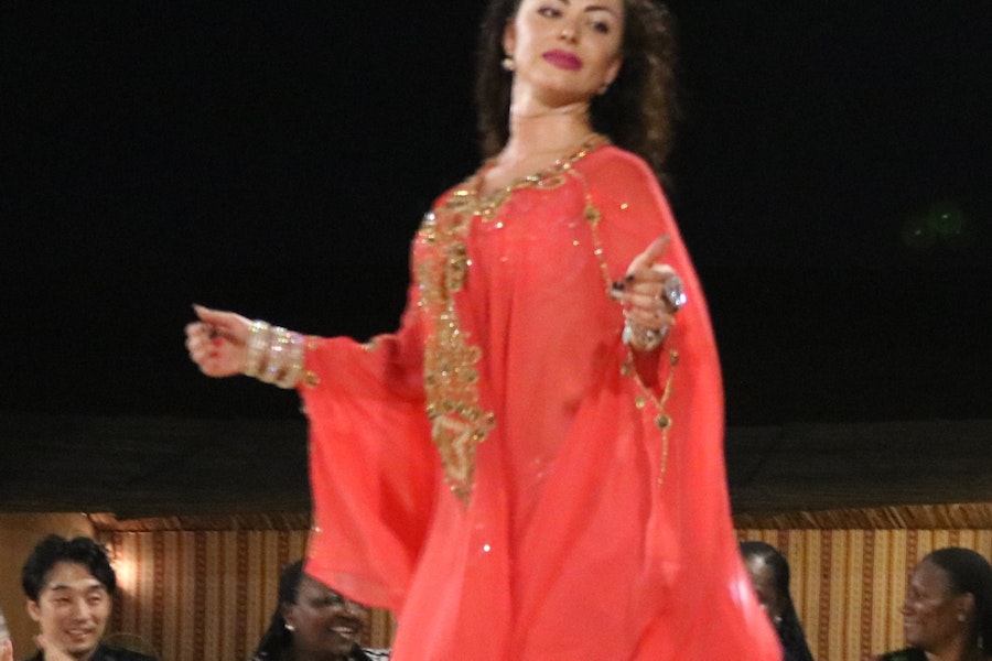 Middagen är en grillbuffé med vegetariska och icke-vegetariska alternativ, tillsammans med sallader, arabiskt bröd och lokala desserter. Under kvällen kan du njuta av levande underhållning: magdans, tanoura-dans, eldshower och arabisk musik. Ljusen från öknen, nattstämningen och stjärnhimlen gör stunden magisk.