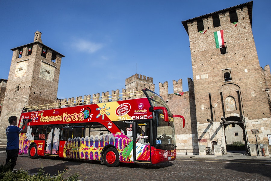 Du kan utforska staden i din egen takt och hoppa av vid de hållplatser du väljer, resa längs vägarna A och B som passerar över 15 av stadens ikoniska platser och monument, inklusive Julias hus, den romerska teatern, Castelvecchio och Basilica of St Zeno.