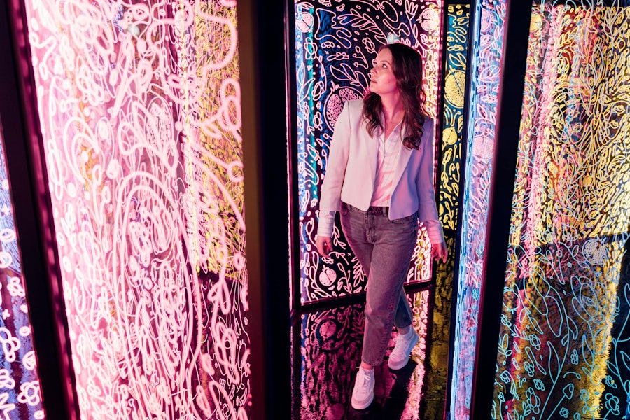 Vandra bland färgstarka landskap, oändliga speglar, neonljus och överraskande texturer. Fördjupa dig i utrymmen som är utformade för att få kontakt med dina känslor och njut av en rundtur där du är en del av konstverket.