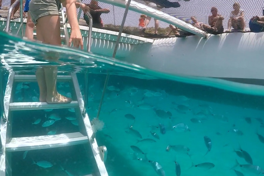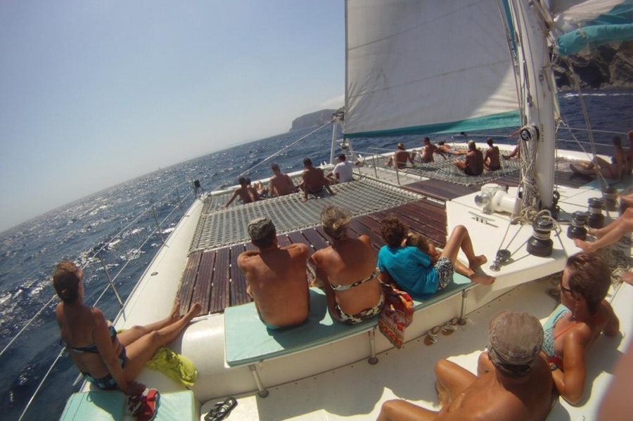 Under överfarten kan du ta ett dopp eller ge dig ut på en kort snorklingssession - maskeringår (deposition €10) - och koppla av i solen på katamaranens nät. Alla drycker ingår ombord, så allt du behöver tänka på är att varva ner.