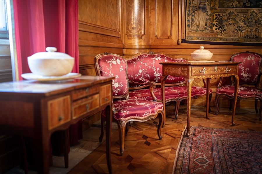 När du vandrar genom interiören kommer du att upptäcka utsmyckade salonger, privata rum, rikt dekorerade foajéer och personliga samlingar som visar den förfinade smaken hos den tidens aristokrati. Varje rum har noggrant bevarats, från ljuskronorna och mattorna till möblerna och vardagsföremålen, vilket ger en intim och realistisk inblick i en förmögen familjs hemmiljö.